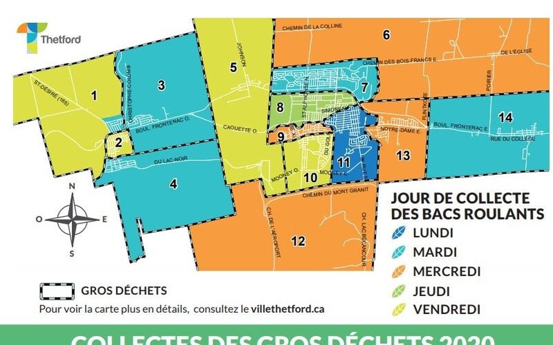 Les citoyens sont invités à consulter dès maintenant le calendrier sur le site Web de la Ville au www.villethetford.ca sous l'onglet Environnement afin de connaître les dates des diverses collectes pour leur secteur. Finalement, toutes les personnes intéressées à en apprendre davantage sur le tri des matières résiduelles peuvent composer la ligne Info-bac 418 335-3132.