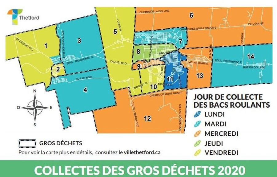 Toutes les informations et la carte concernant les gros déchets se trouvent au verso du calendrier 2020. Comme par les années passées, tous les secteurs sont numérotés et divisés par des pointillés. La carte de la ville est désormais divisée en 14 secteurs différents afin d'en simplifier la compréhension. Certaines spécifications ont été ajoutées sous le nom des secteurs pour délimiter les zones concernées par les collectes printanières et automnales. Finalement, la collecte dans la zone 13 près de l'hôpital sera à la suite des autres secteurs de Thetford centre