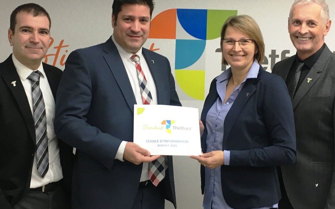 Thetford Mines, 16 décembre 2019. Lors d'un point de presse tenu le 16 décembre 2019 à l'hôtel de ville de Thetford, le maire et les membres du conseil municipal ont présenté, avec beaucoup d'enthousiasme, un budget équilibré de 44 420 899 $ pour l'année 2020. C'est lors de la séance extraordinaire du 19 décembre prochain que celui-ci sera officiellement adopté.