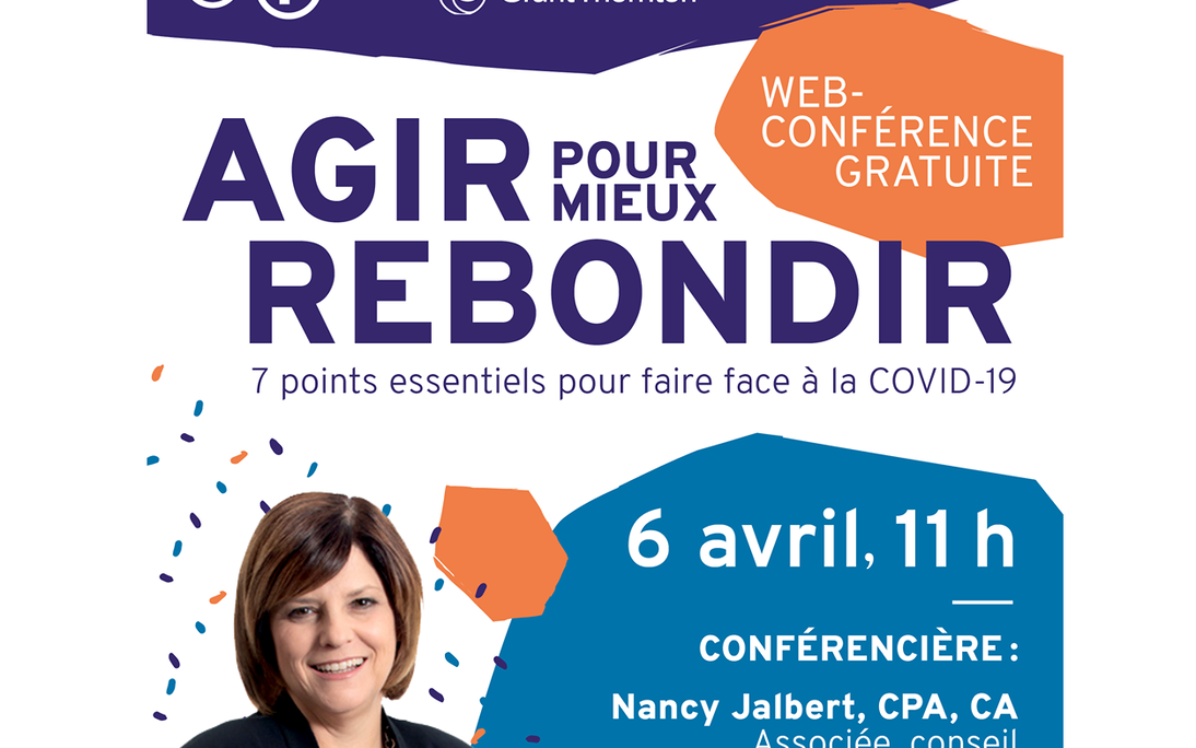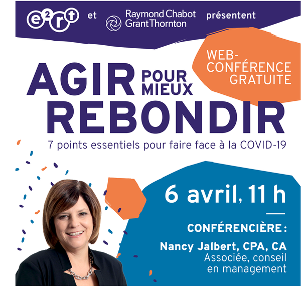 L'Espace entrepreneuriat région Thetford (E2RT) tiendra une Webconférence GRATUITE et ouverte à tous intitulée COVID-19 : Agir pour mieux rebondir animée par Mme Nancy Jalbert, CPA, CA, Associée chez Raymond Chabot Grant Thornton lundi prochain, le 6 avril de 11h à 12h15.