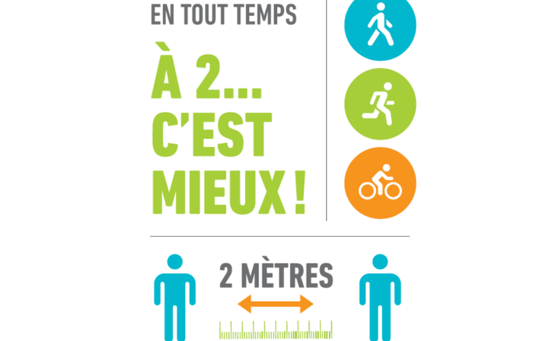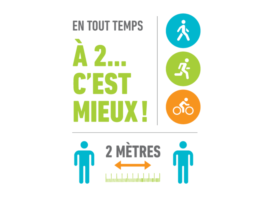 À cet effet, des affiches seront installées d'ici quelques jours sur le parcours de la piste cyclable afin de rappeler aux citoyennes et aux citoyens la consigne de distance physique de deux mètres exigée par la Santé publique. Également, afin d'assurer la sécurité des usagers, nous rappelons que des panneaux de règlementation sont également présents. La Ville sollicite la population au respect de ces consignes essentielles.