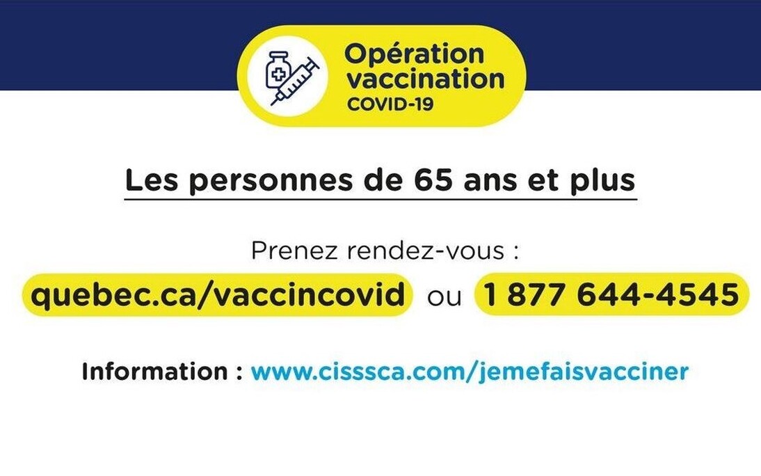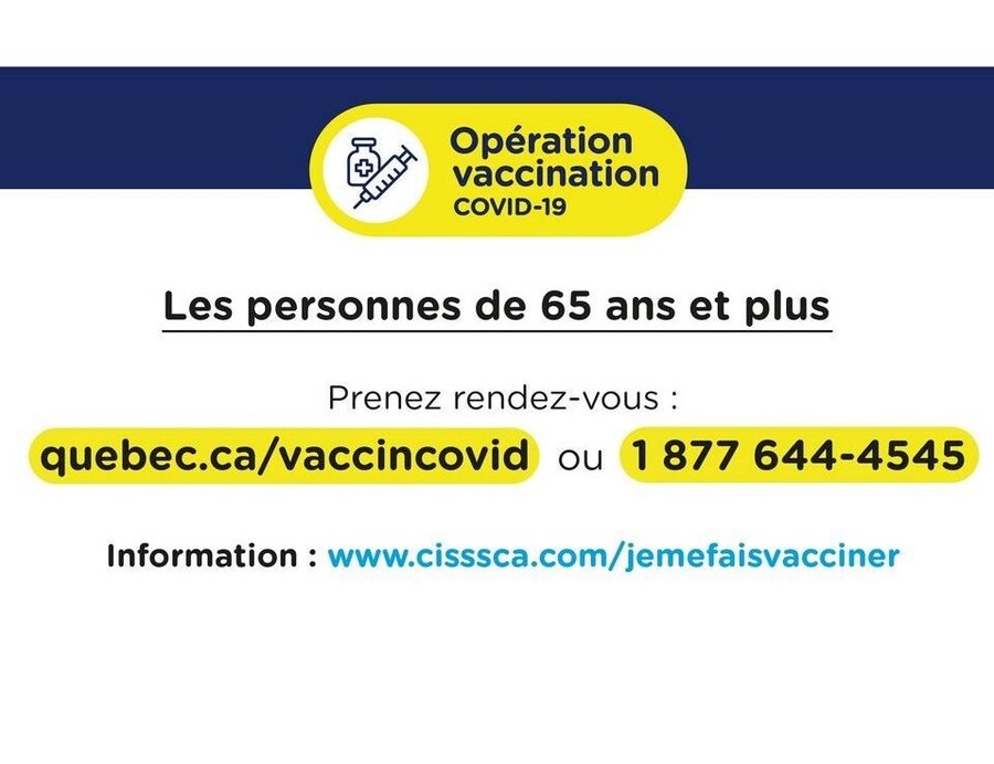Chaudière-Appalaches, le 19 mars 2021 - Dès aujourd'hui, les personnes de 65 ans et plus (nées en 1956 et avant) sont invitées à prendre rendez-vous pour se faire vacciner.