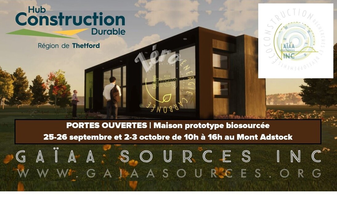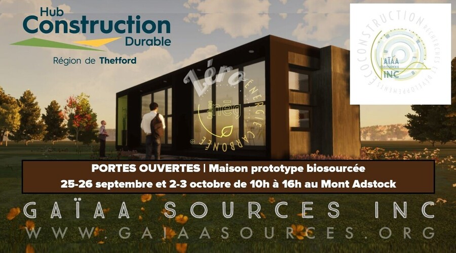 De plus, vous êtes invité à visiter une maison prototype biosourcée les 25-26 septembre et les 2-3 octobre, de 10 h à 16 h, au Mont Adstock. À cette occasion, vous pourrez rencontrer les concepteurs de cette maison avant-gardiste.