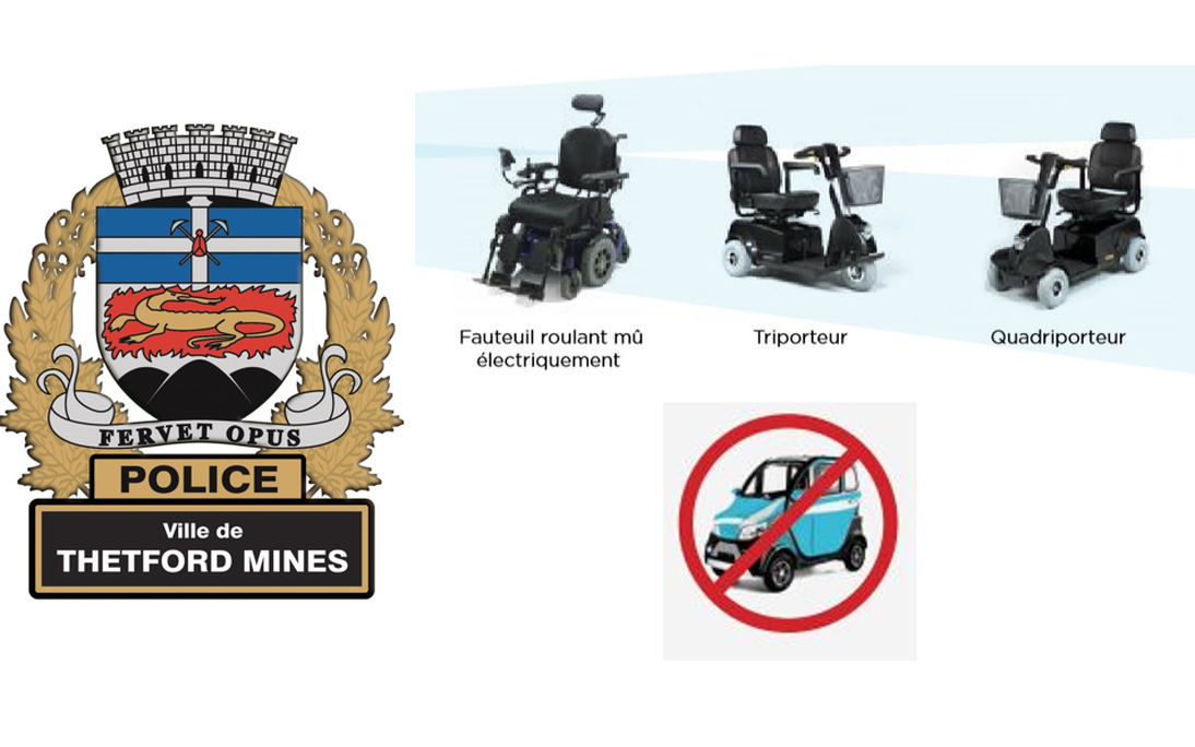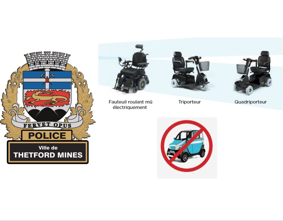 « Seuls les appareils correspondant à la description ci-dessus peuvent circuler sur les chemins publics en vertu des règles prévues aux aides à la mobilité motorisées. Les modèles de triporteurs et de quadriporteurs vendus sur le marché ne sont pas tous conformes à la définition d'une AMM telle qu'elle est établie par le ministre des Transports. Chaque personne doit s'assurer que le modèle qu'elle possède ou souhaite acquérir correspond à la définition d'une AMM afin de pouvoir circuler sur les chemins publics. Les utilisateurs doivent aussi prendre connaissance des règles qui encadrent la circulation des AMM, puisque certaines règles varient selon le type d'AMM utilisé, » a déclaré monsieur Michel Dodier, directeur du Service de police de Thetford Mines.