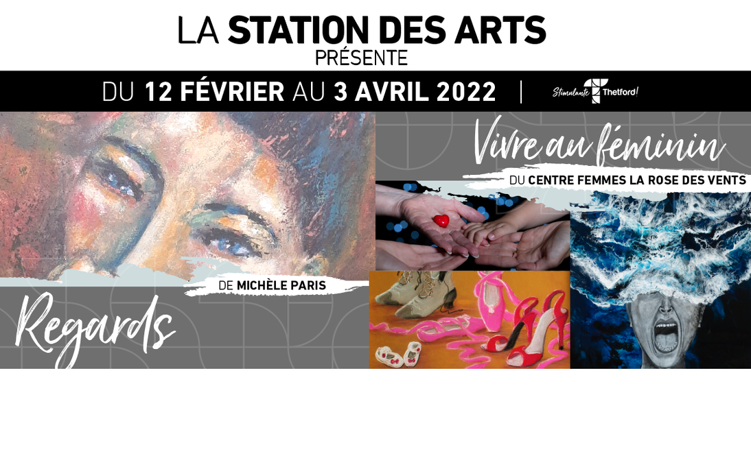 Thetford Mines, le 10 février 2022. Après plusieurs semaines sans activités, la Ville de Thetford Mines est très heureuse d'ouvrir à nouveau les portes de la Station des arts à toute la population. Ainsi, du 12 février au 3 avril prochains, les femmes sont à l'honneur dans deux expositions présentées en simultané : Vivre au féminin du Centre femmes La Rose des vents ainsi que Regards de Michèle Paris.