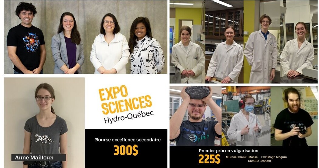 - Bourse collégiale, 2e prix en vulgarisation, 225$ - Sara-Maude Charest, Xavier Julien, Jérémy Moreau et Stacy Picard pour leur projet intitulé La nature, source d'inspiration