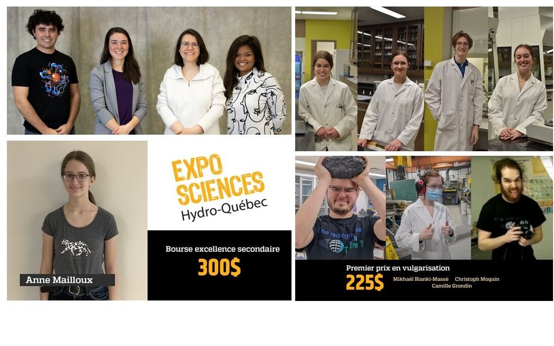- Bourse collégiale, 1er prix en vulgarisation, 350$ - Mikhaël Bianki-Massé, Camille Grondin & Christoph Moquin pour leur projet intitulé Une radiographie de la Terre?