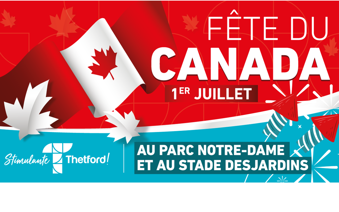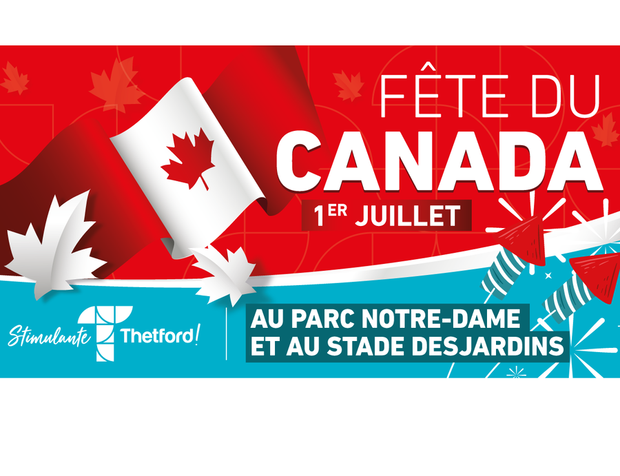 Thetford Mines, le 10 juin 2022. La Ville de Thetford Mines est très heureuse d'annoncer le retour des festivités de la Fête du Canada dans leur formule originale. Le vendredi 1er juillet, la population est invitée à célébrer cette journée qui culminera avec les traditionnels feux d'artifice au stade Desjardins. Plusieurs activités et l'horaire complet de la journée seront annoncées au cours des prochains jours.