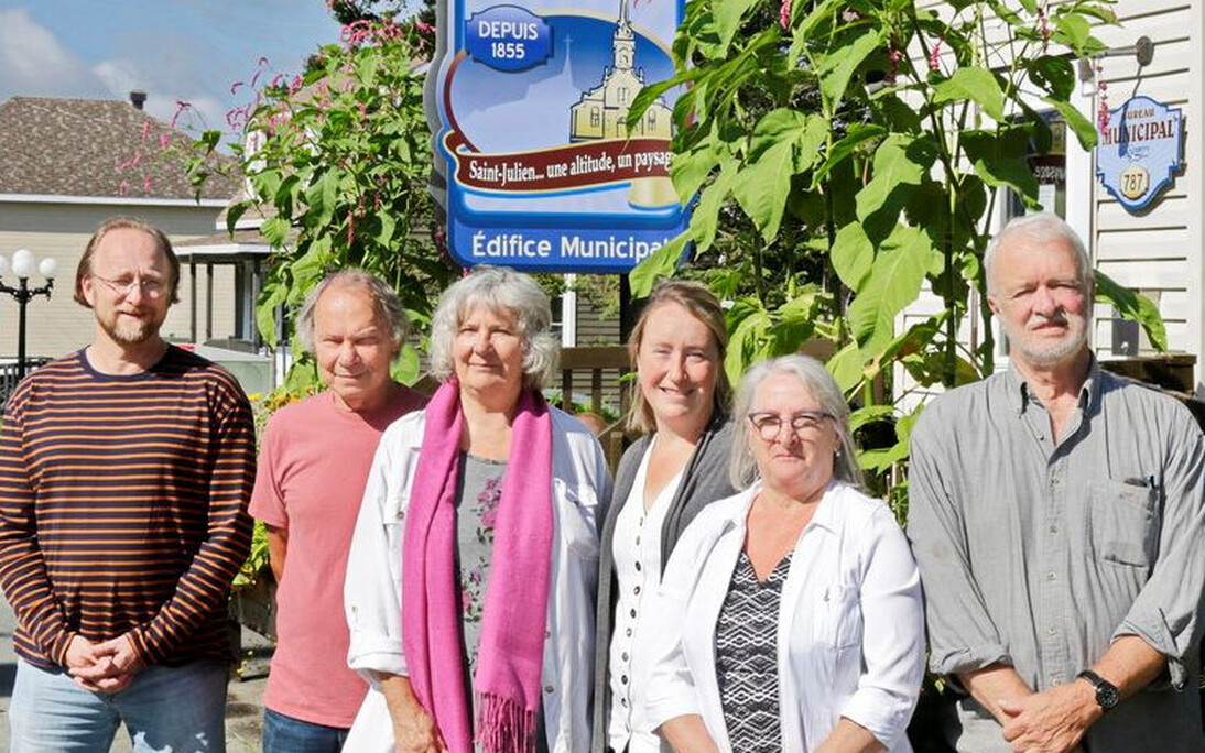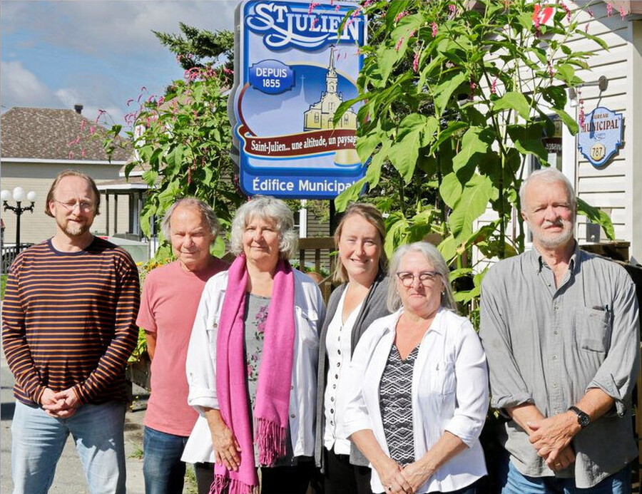 Photo : Les membres du comité de pilotage de la municipalité (de gauche à droite) : Le directeur général de la municipalité M. Martin Cloutier; Le conseiller municipal responsable des questions Familles et Ainés, M. René Saint-Louis; Les citoyennes de Saint-Julien, mesdames Sylvie Maurice, Marie Lussier et Martine Therrien, ainsi que Michel Tremblay, citoyen lui aussi.
