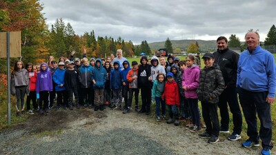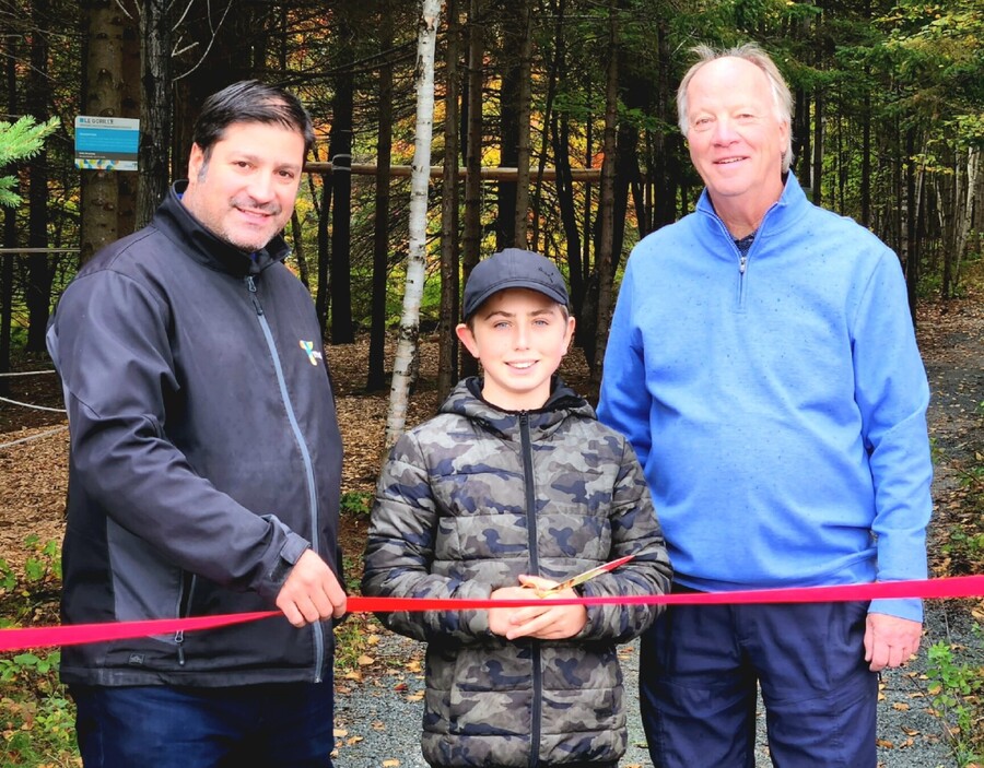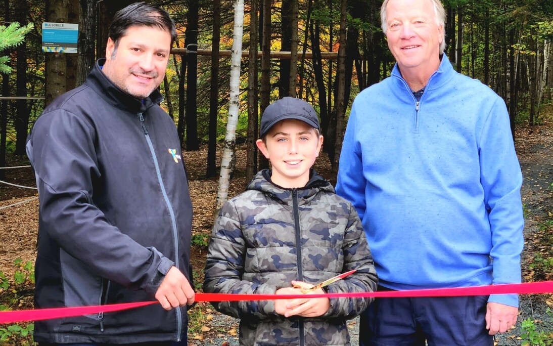 Thetford Mines, 28 septembre 2022. - Le 27 septembre, en compagnie de ses camarades de classe, le jeune Samuel Dubois, gagnant du budget participatif 2021 - volet jeunesse, a eu l'occasion d'inaugurer son « Sentier Défi Hébertisme ». C'est au parc du P'tit Cap que toute la population pourra désormais s'amuser dans le parcours situé en forêt qui propose des déplacements sur différentes installations munies de cordages et de câbles.
