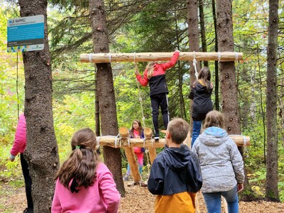 En compagnie de ses camarades de classe, le jeune Samuel Dubois, gagnant du budget participatif 2021, a pu découvrir les douze modules du nouveau Sentier Défi Hébertisme situé au parc du P'tit Cap.