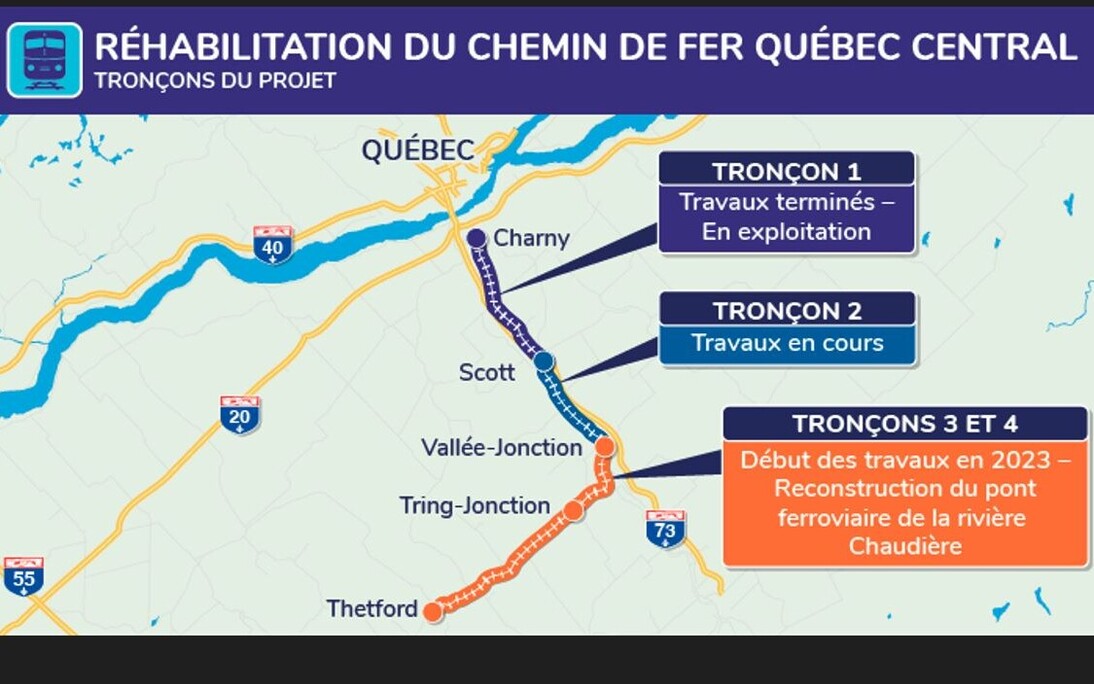 Pour plus d'information sur la réhabilitation du chemin de fer Québec Central, consultez la page Web du projet sur le site du Ministère.