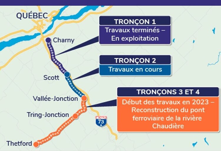 La réhabilitation du tronçon entre Vallée-Jonction et Thetford Mines, totalisant 58 kilomètres de rail, consiste à la reconstruction de 17 ponts ferroviaires, ainsi qu'à la réalisation de l'ensemble des travaux de voie, incluant le remplacement de 102 ponceaux. Le pont ferroviaire à Vallée-Jonction, au-dessus de la rivière Chaudière, est la structure la plus importante à reconstruire dans le cadre du projet.