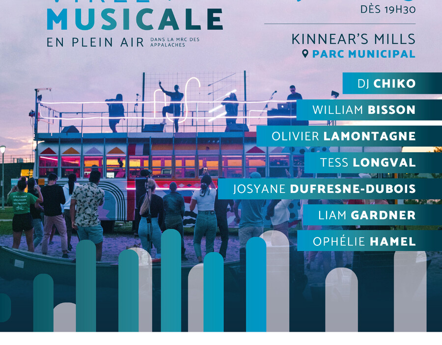 La MRC des Appalaches présente le deuxième spectacle de La Virée musicale en plein air le vendredi 16 juin à 19 h 30 dans le magnifique parc de la Municipalité de Kinnear's Mills bordant la rivière Osgood. C'est une nouvelle mouture de jeunes talents de la région qui grimperont sur la scène du Mixbus pour divertir les gens de toutes générations.