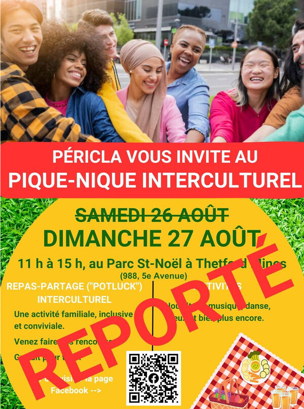 MISE À JOUR : En raison de la pluie annoncée ce samedi 26 août, PÉRICLA_Page se voit forcer de reporter le pique-nique interculturel au dimanche 27 août. Cette activité se déroulera toujours au Parc-Saint Noël de Thetford Mines (988, 5e Avenue) de 11h à 15h.