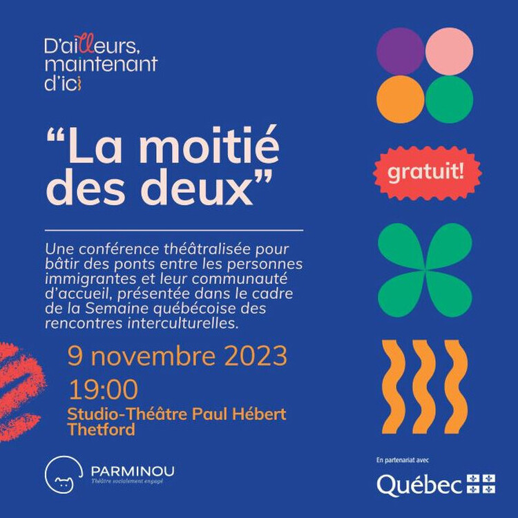 Thetford Mines, le 2 novembre 2023. - La MRC des Appalaches en partenariat avec le Théâtre Parminou sont heureux de présenter la conférence théâtralisé « La moitié des deux ». Cette initiative s'inscrit dans le cadre de la Semaine québécoise des rencontres interculturelles 2023 et vise à encourager le dialogue et le rapprochement interculturel et à promouvoir l'importance de l'égalité entre les Québécoises et les Québécois de toutes origines. L'événement présenté gratuitement aura lieu le 9 novembre prochain, à 19 h au Studio-Théâtre Paul Hébert.