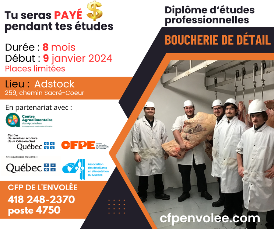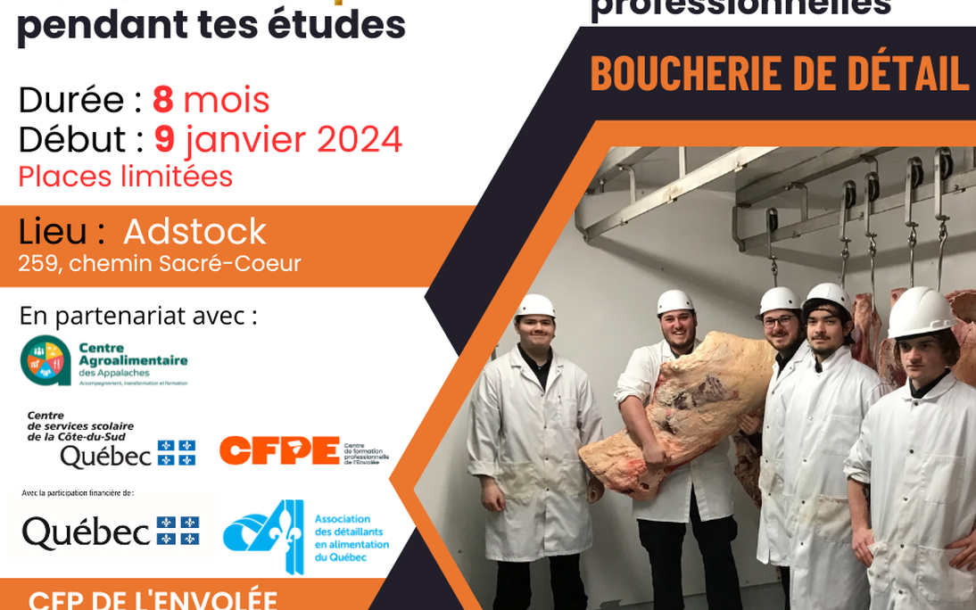 En collaboration avec le Centre de Formation Professionnelle de l'Envolée de Montmagny, le Centre agroalimentaire des Appalaches est heureux d'annoncer qu'une formation en boucherie de détail (DEP) sera offerte dès janvier 2024. La formation d'une durée de 900 heures se donnera directement sur place au Centre agroalimentaire des Appalaches situé à Adstock.
