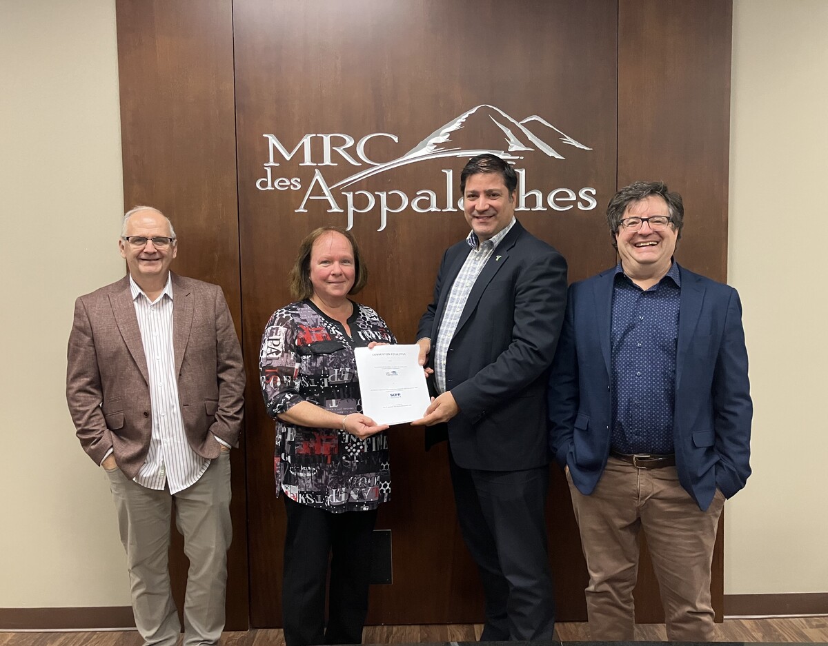 Sur la photo, de gauche à droite : Mario Jean, conseiller syndicale SCFP, Renée Vachon, présidente du SCFP 3647, Marc-Alexandre Brousseau, préfet de la MRC des Appalaches et maire de la Ville de Thetford Mines et Rick Lavergne, directeur général de la MRC des Appalaches.