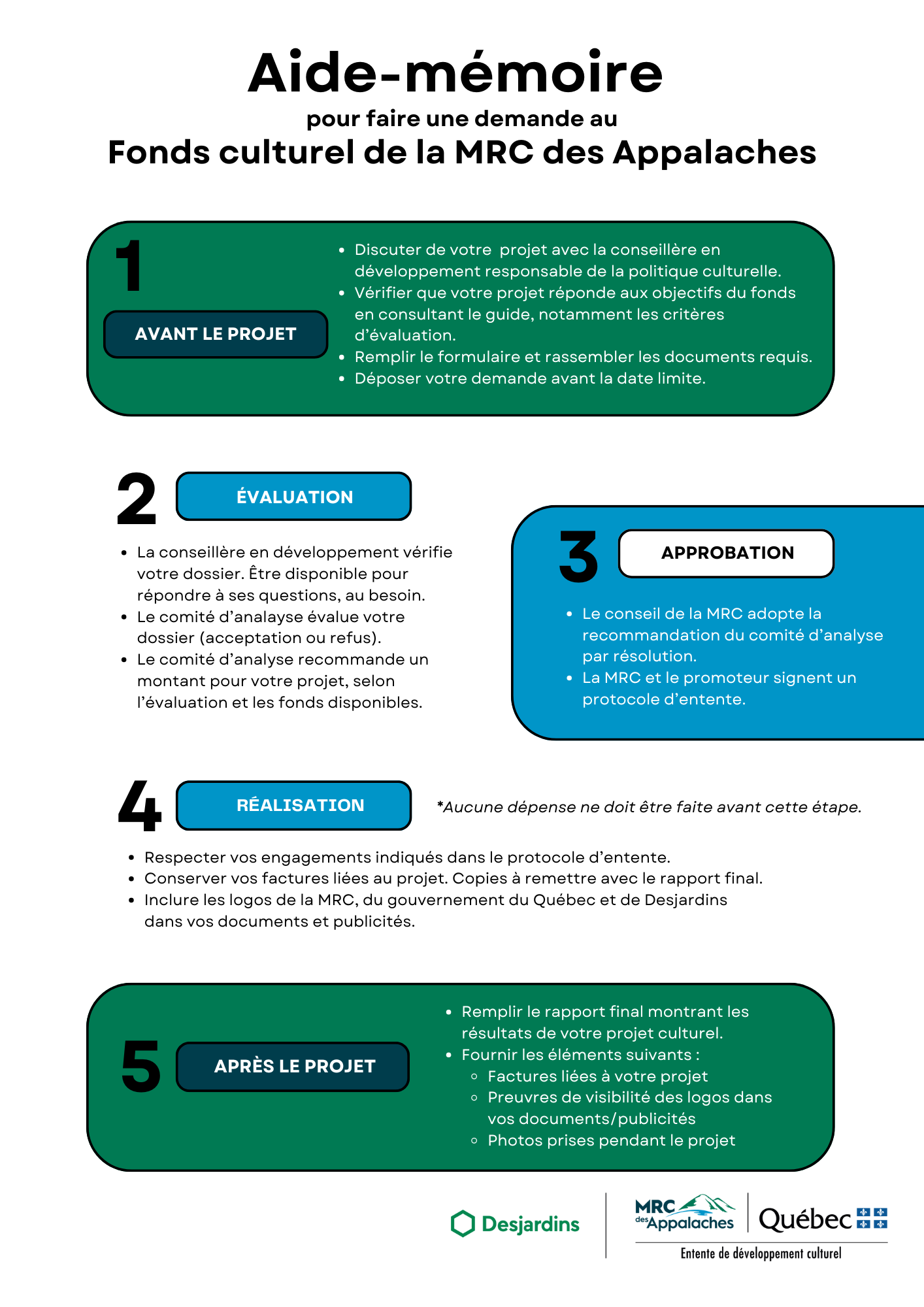 Cette mesure d'aide financière permet de soutenir des initiatives culturelles et artistiques qui se déroulent sur le territoire des 19 municipalités de la MRC des Appalaches. Un appel à projets est lancé à chaque printemps.